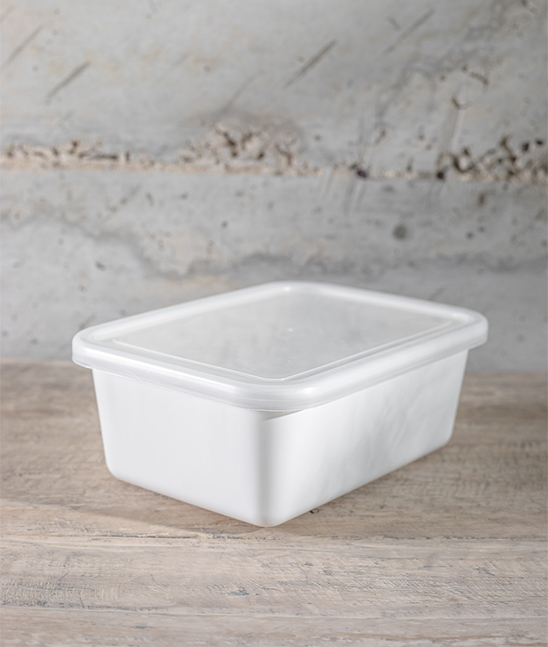 קופסאת אחסון מרווחות עשויה אמייל לבן בגימור מבריק ונקי, עם מכסה שקוף שמספק אטימה נוחה ויעילה