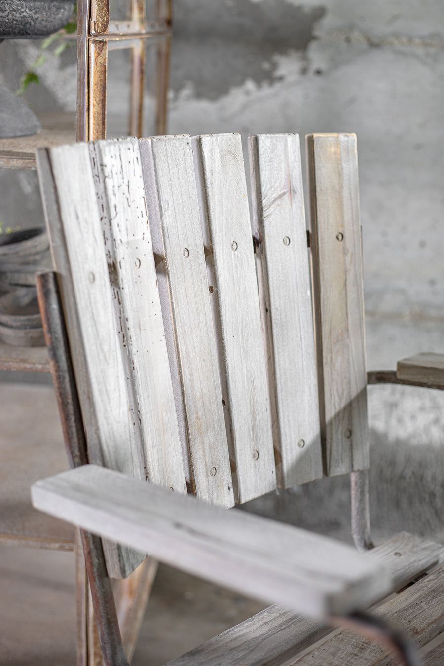 כיסא ייחודי המשלב בין פשטות מחוספסת לאסתטיקה טבעית, עם מושב ומשענת עשויים קורות עץ בגוון טבעי מחוויר וסטנד ברזל בגוון חלודה עדינה