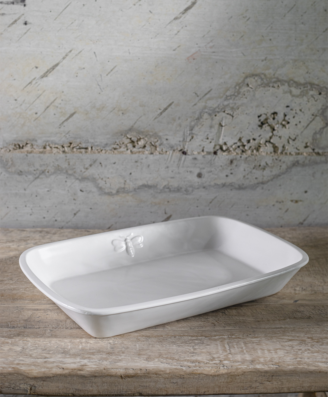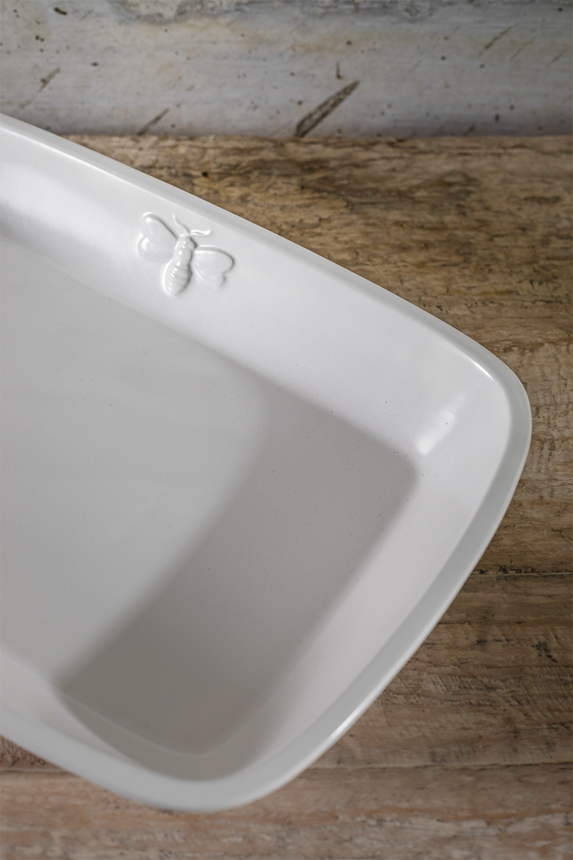 מגש קרמיקה מלבני בגימור מאט לבן, עם דוגמת דבורה עדינה בולטת בדופן