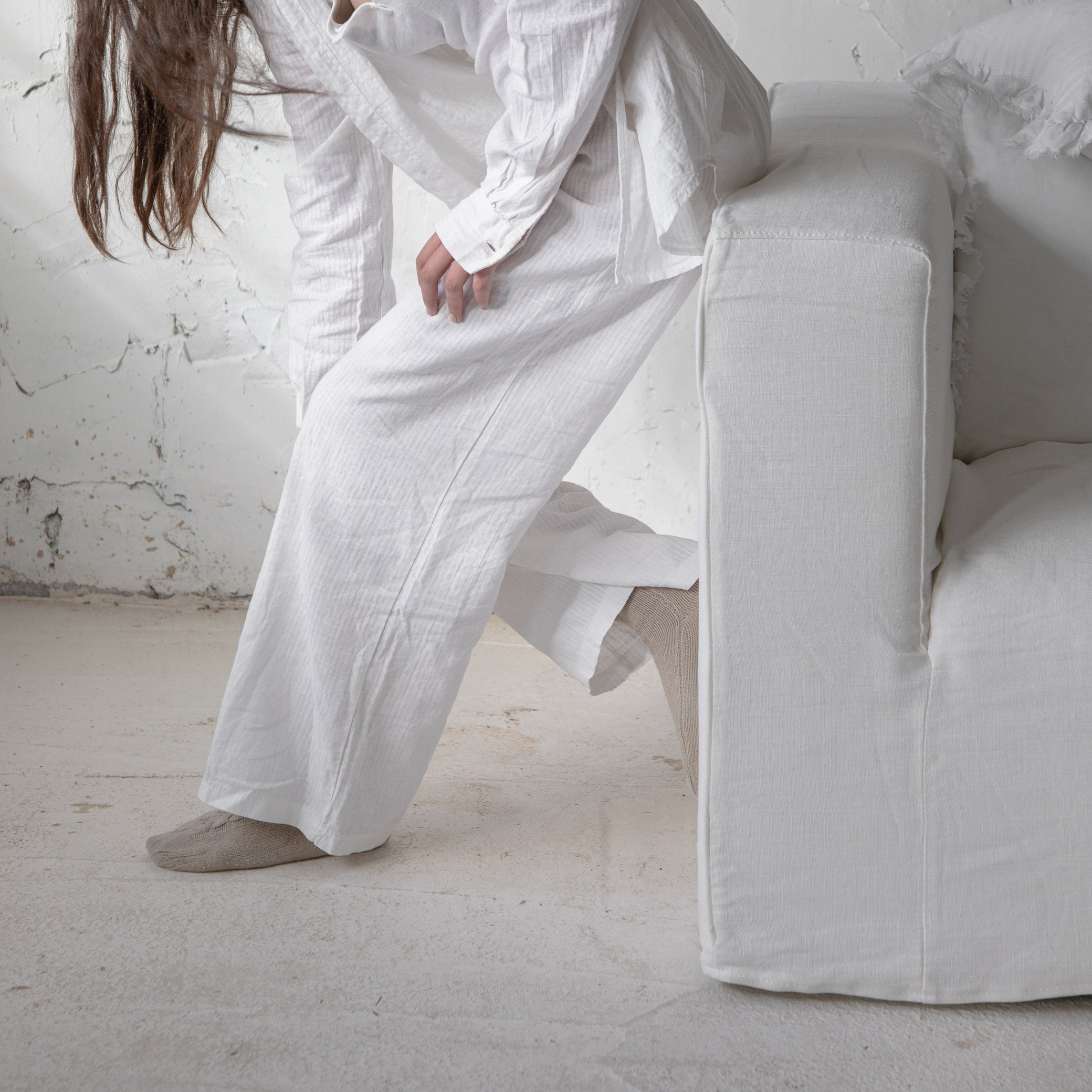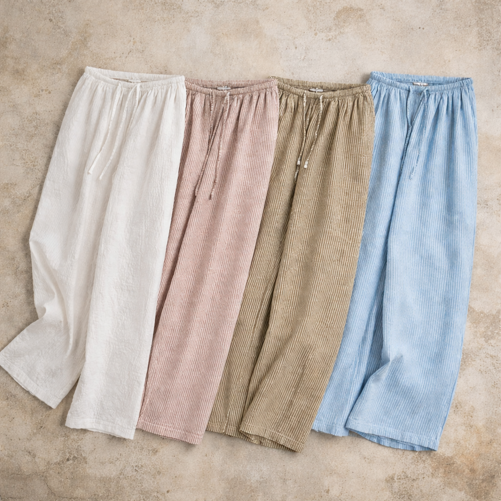 מכנסיים עשויים פשתן טבעי ונושם עם פסים עדינים, בגזרה רחבה ונינוחה וגומי במותן לנוחות מושלמת לאורך כל היום. הבד קליל ורך על הגוף, מאפשר תנועה חופשית ותחושת רעננות