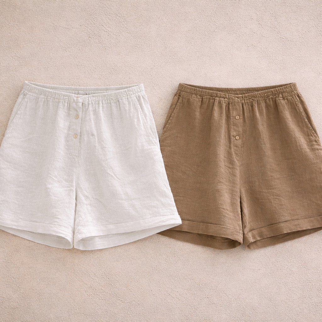 מכנסיים קצרים מפשתן טבעי ונושם בגזרה נינוחה עם מותן גמישה וכפתורים עדינים בחזית למראה טבעי ומעוצב. הבד רך וקליל, נעים על הגוף ומושלם לימים חמים ולרגעים רגועים של יום־יום