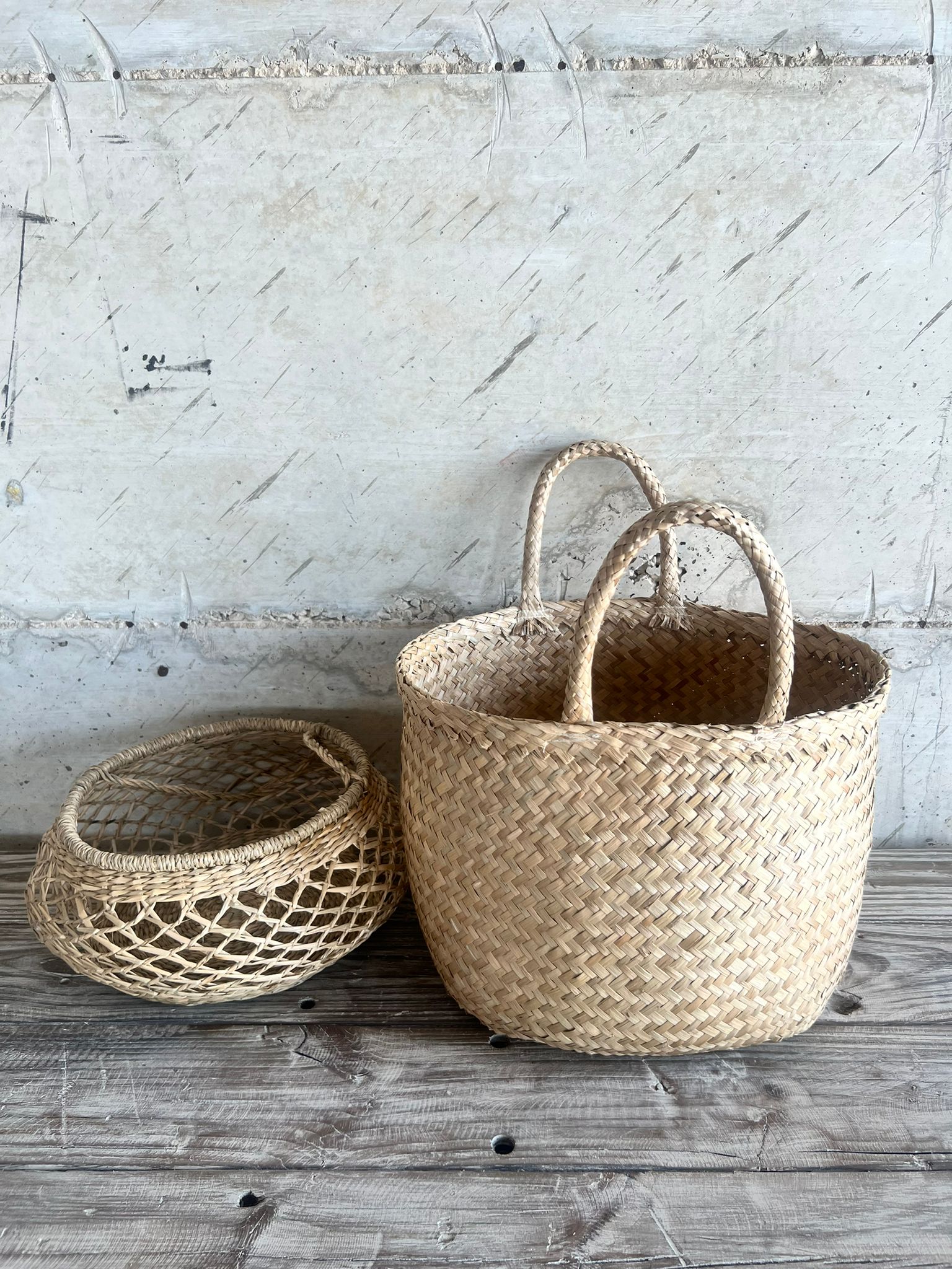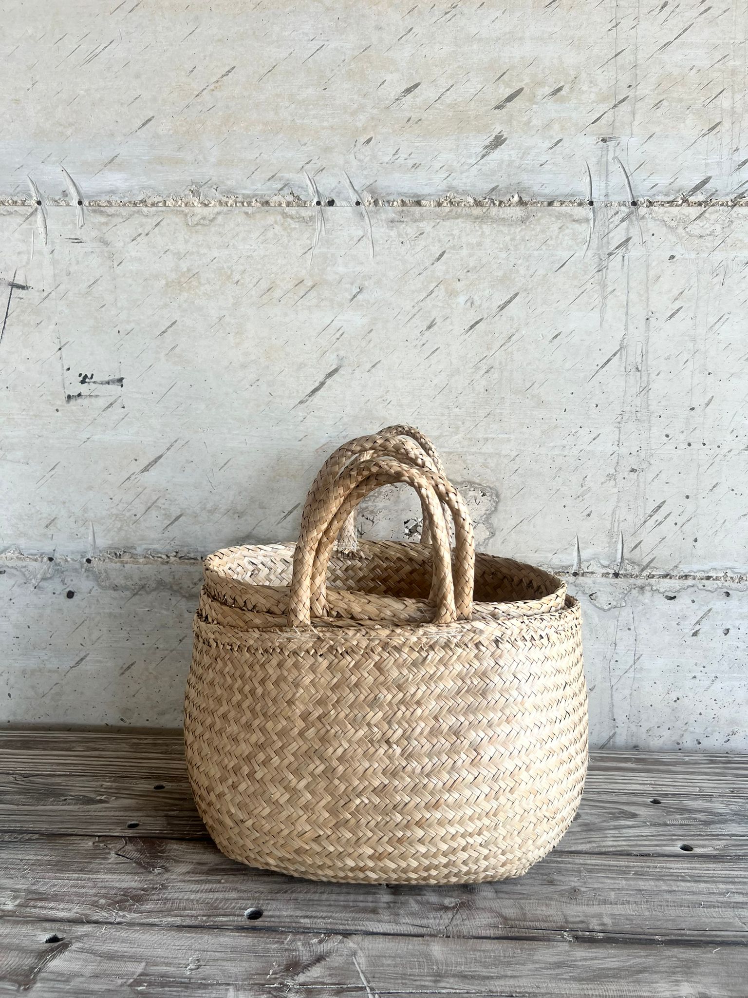 סל קלוע בעבודת יד, בקווים עגולים ורכים, עשוי מקש טבעי בגוון בהיר וחמים. הסל משתלב באופן מושלם בעיצוב פנים ומביאים תחושת פשטות, חמימות וניקיון לחלל