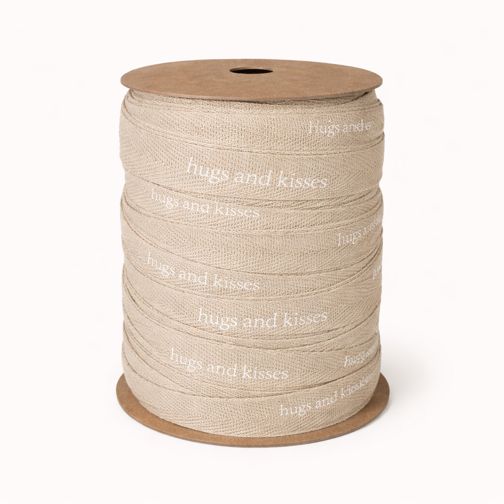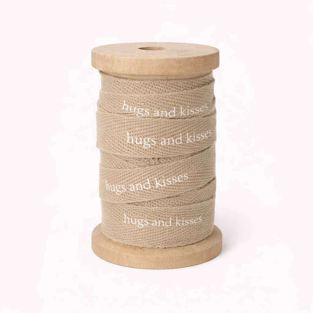 סרט בד בגוון בז’ טבעי עם טקסטורה רכה והדפס עדין של המילים חיבוקים ונשיקות,   מלופף על גליל עץ טבעי. מעניק תחושה חמימה ואוהבת לכל אריזה, עיצוב או פרויקט יצירה, מושלם למתנות, אירוח ומיתוג רגשי