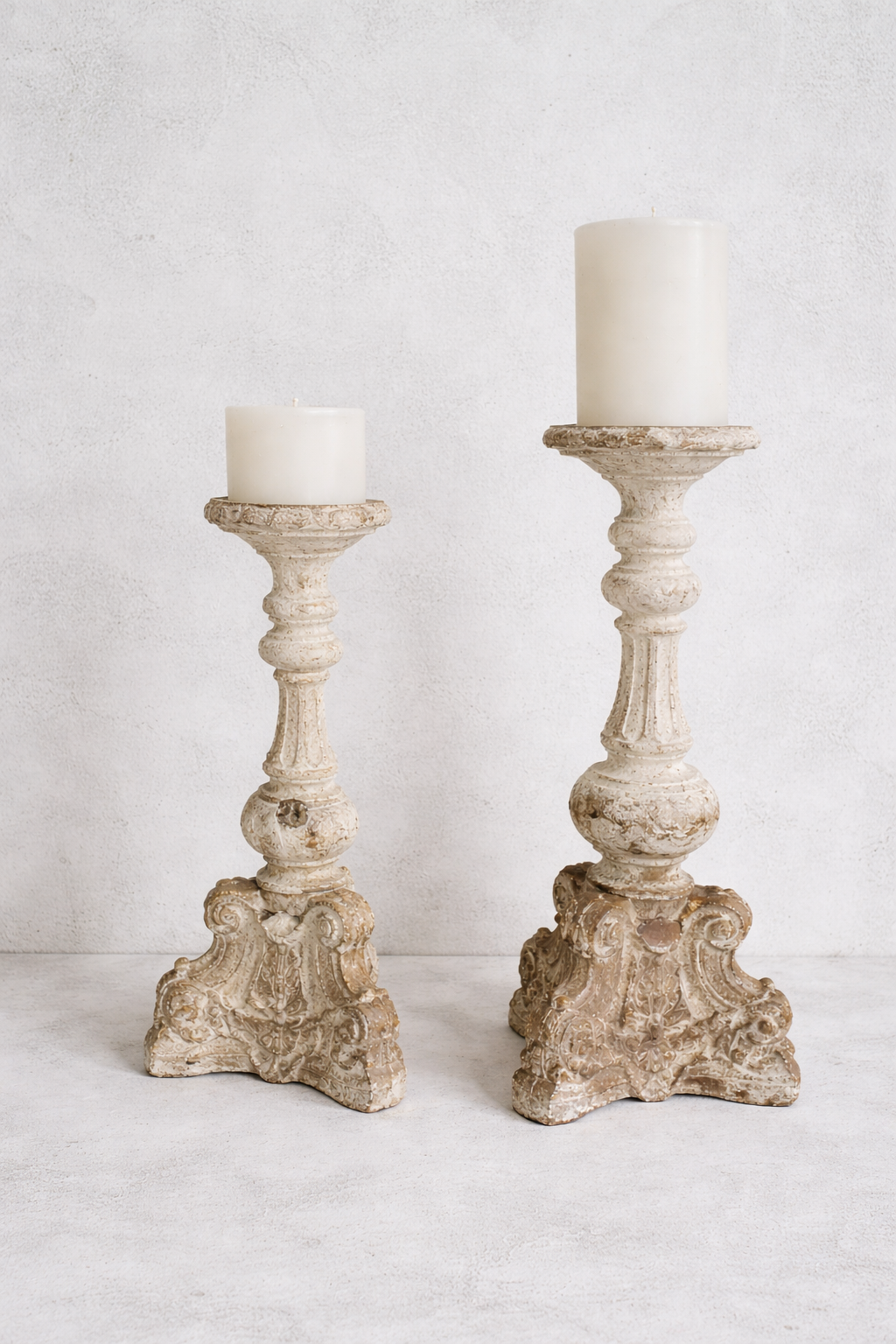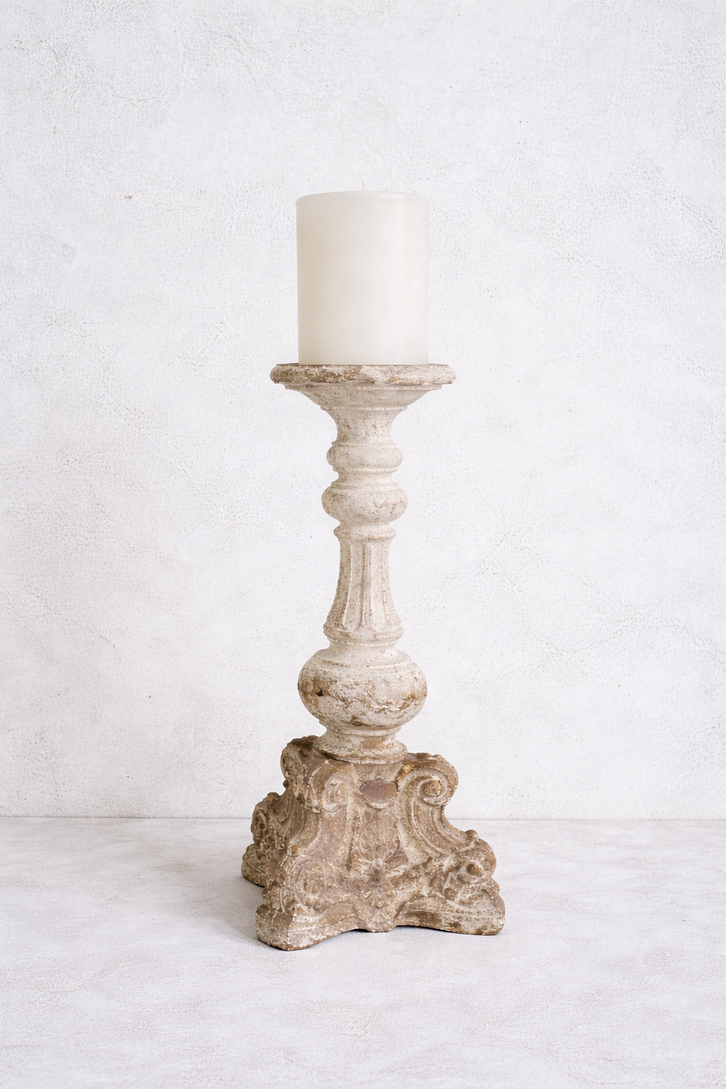 פמוט דקורטיבי מרשים בהשראת עיצוב אירופאי עתיק, עם פרטים מגולפים בעבודת יד וגימור מיושן עדין שמעניק תחושת חמימות ואותנטיות
