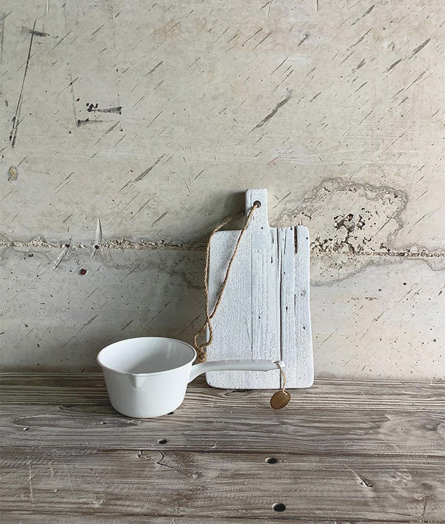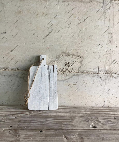 לוח חיתוך מעץ ממוחזר בגוון לבן דהוי — כל חריץ, כל כתם, הוא חלק מהקסם