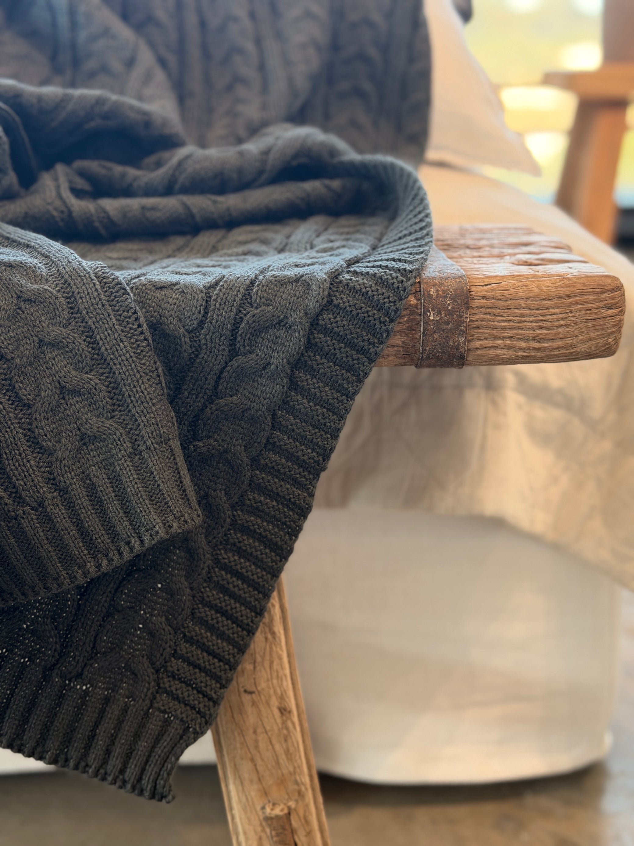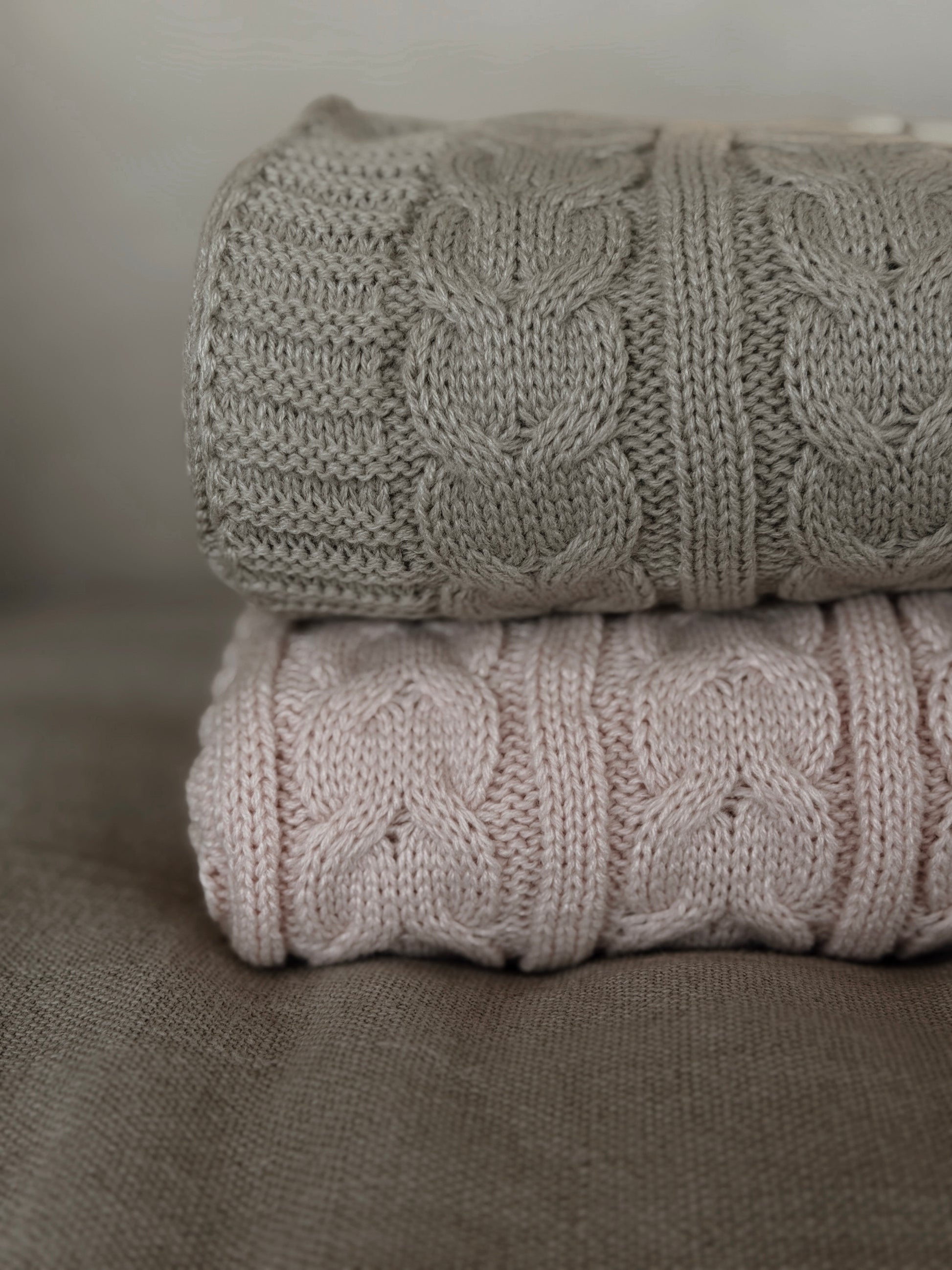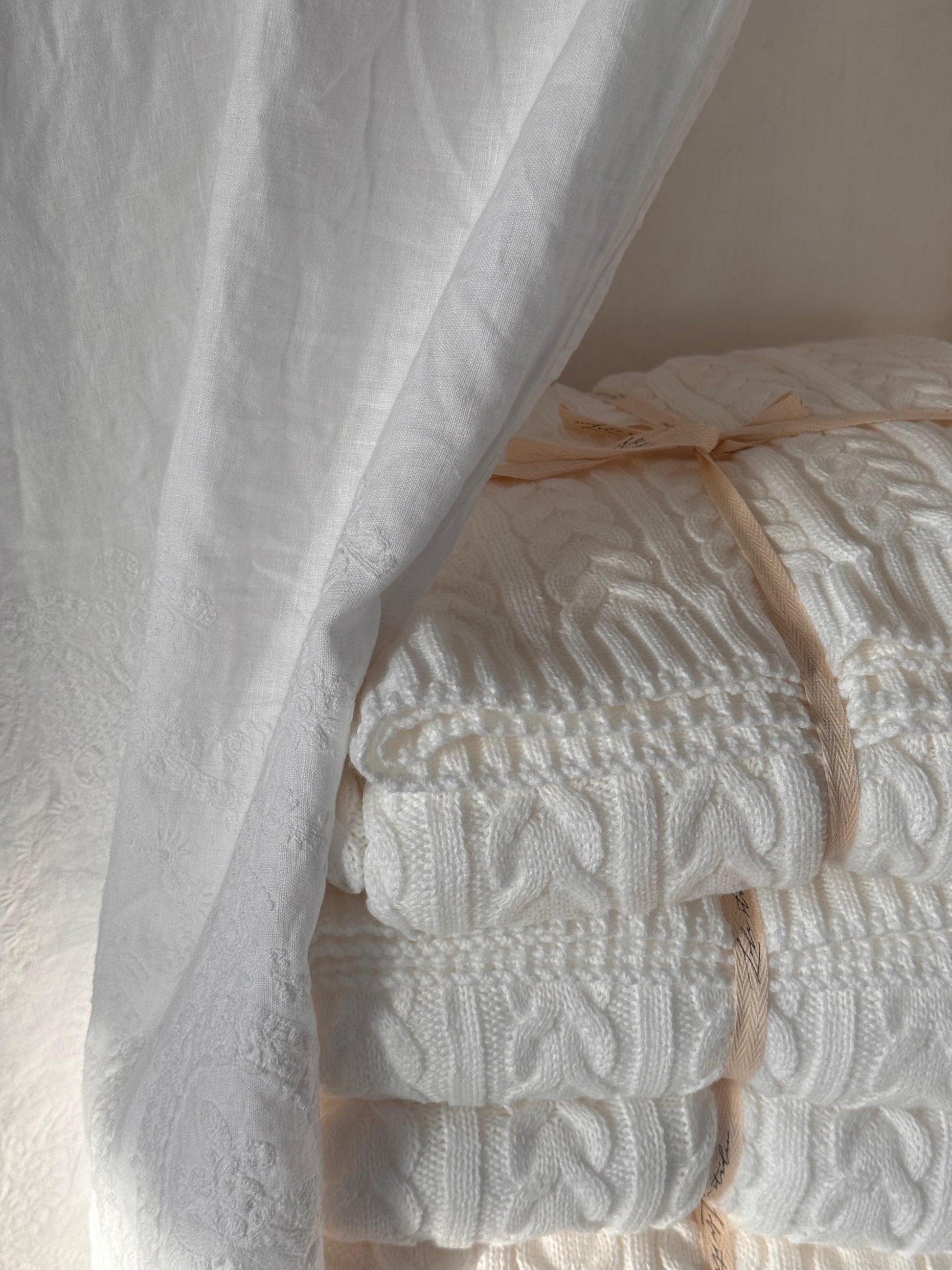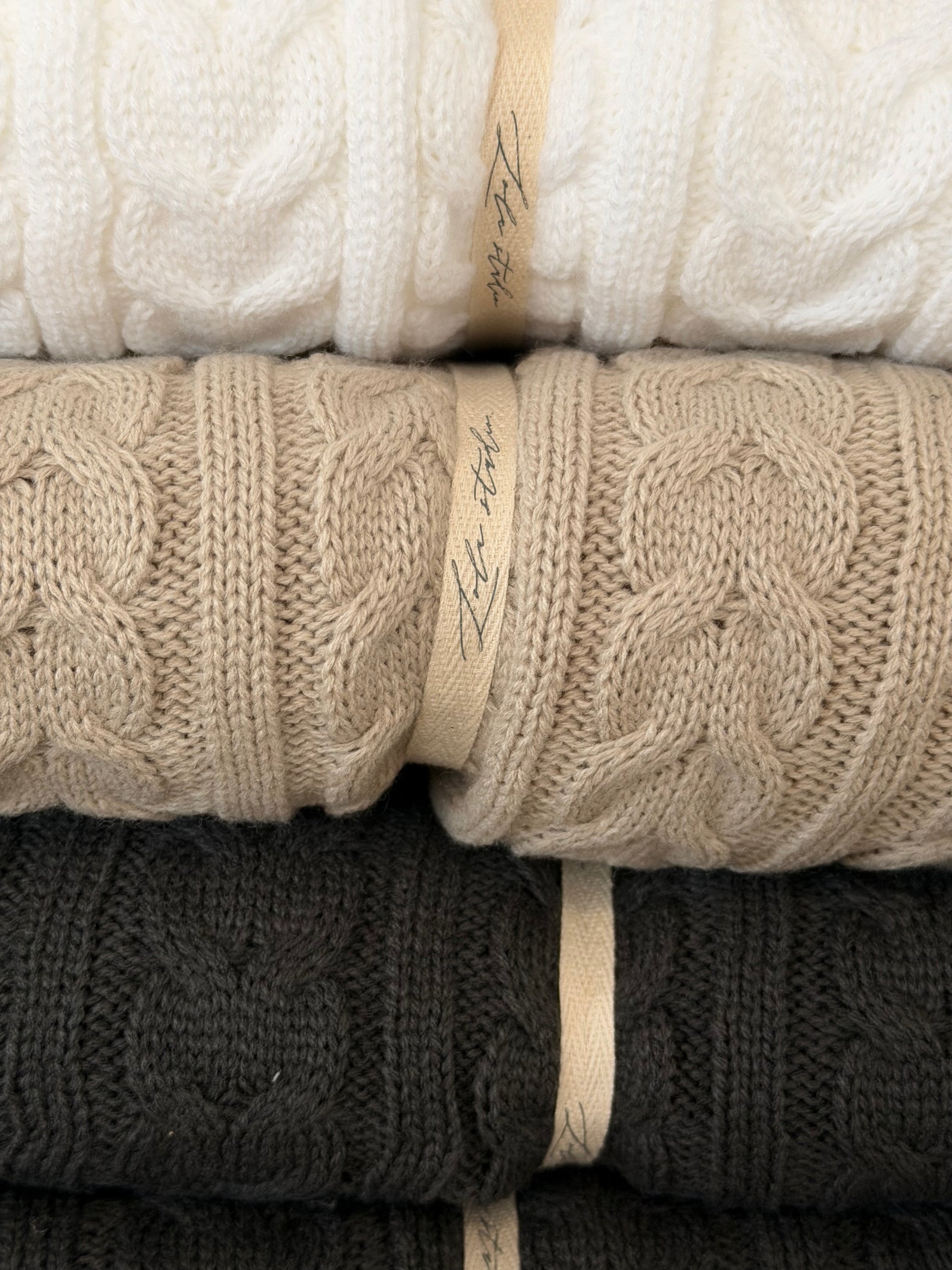 שמיכה רכה וסרוגה במרקם כבלים עדין, עשויה חוטים טבעיים בגוונים שקטים של לבן, חול ופחם