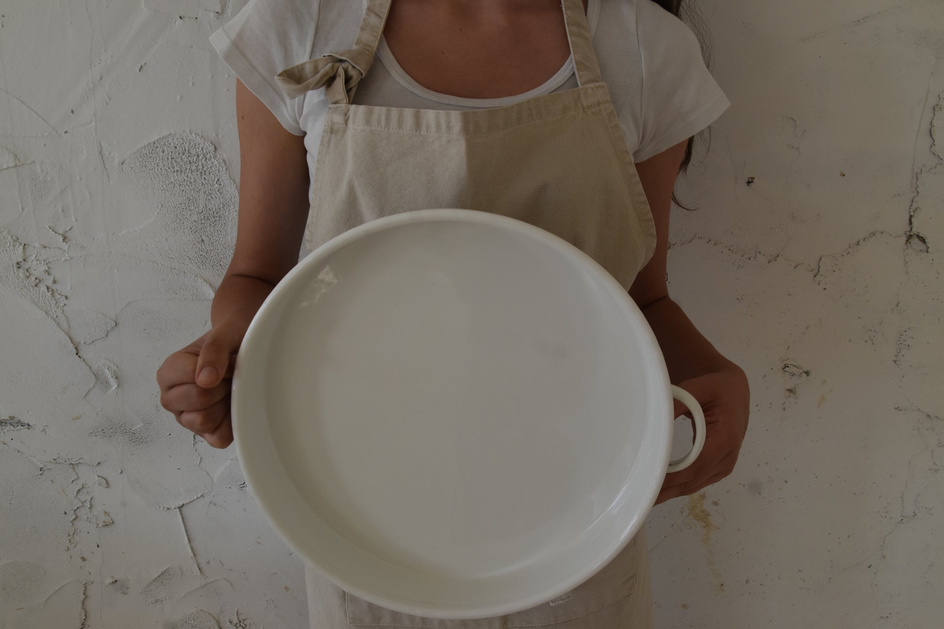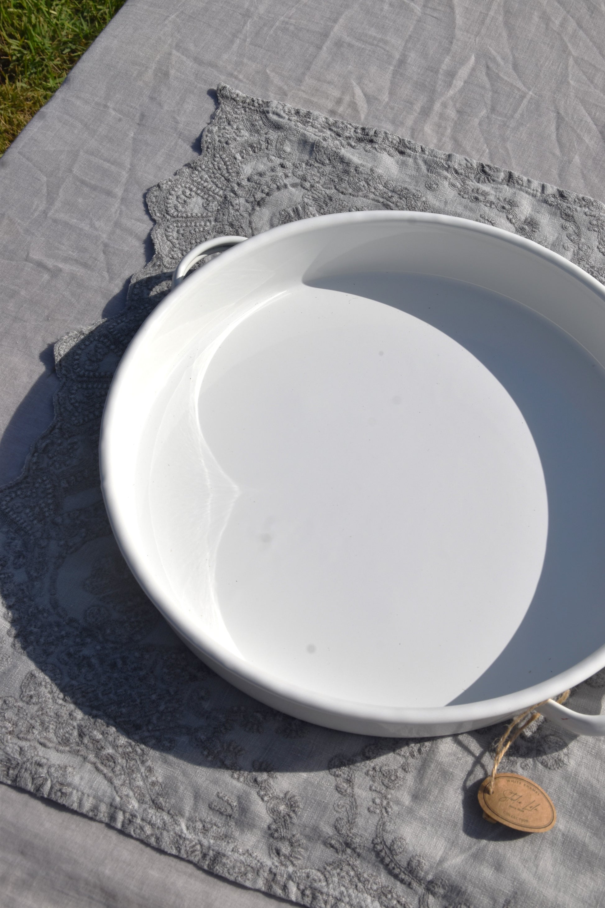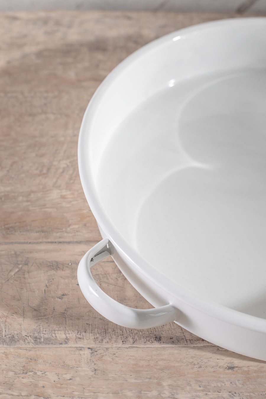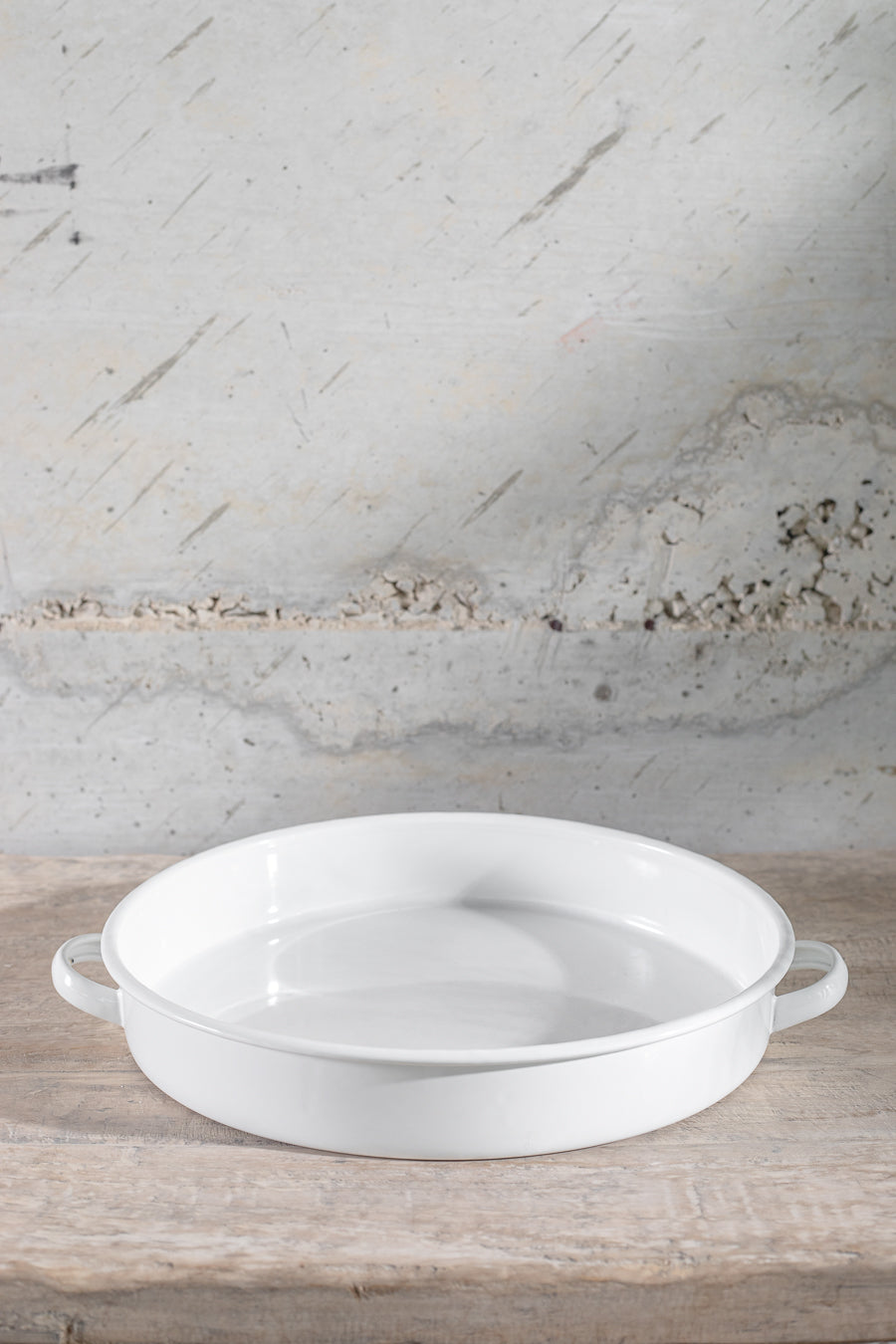 תבנית אפייה עגולה עשויה אמייל איכותי, בגוון לבן נקי ועמוק שמחמיא לכל שולחן